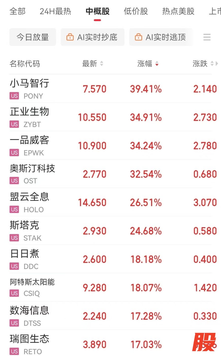 小马智行涨39.41%,正业生物涨34.91%。