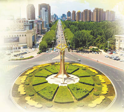 位于包头市中心的“三鹿腾飞”雕塑,小丽花在雕塑周围灿烂绽放。 李 强摄